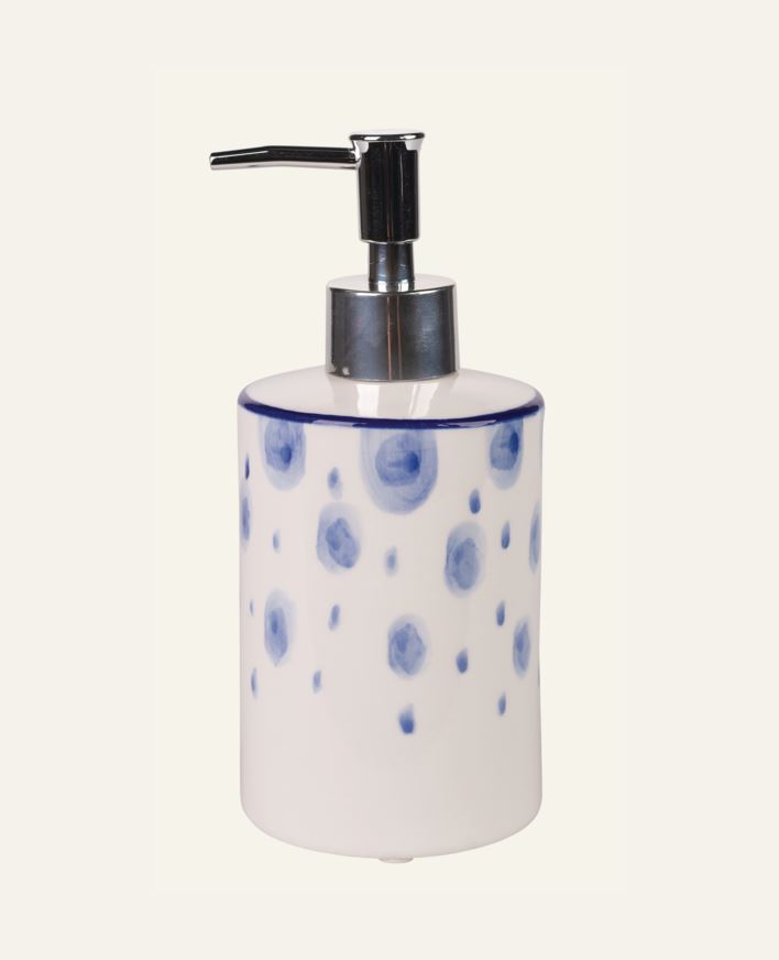 Dekorativ såpedispenser i hvit og blått.