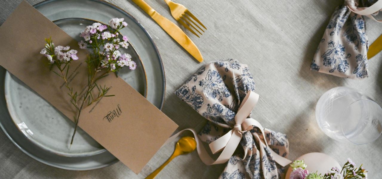 - Ved bruk av tøyservietter har man ofte serviettringer eller bånd rundt servietten - det kan være kjempefint å feste bordkortet til den, så den er godt synlig midt på tallerknen. Gjerne sammen med en blomst, en barkvist eller rett og slett sammen med bestikket.