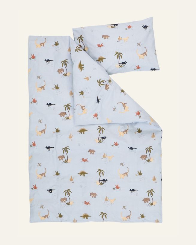 Sengesett i 100% økologisk bomull med tøft dinoasurmønster. Putetrekk har sideåpning, dynetrekk har åpning i bunn og glidelåslukking.
