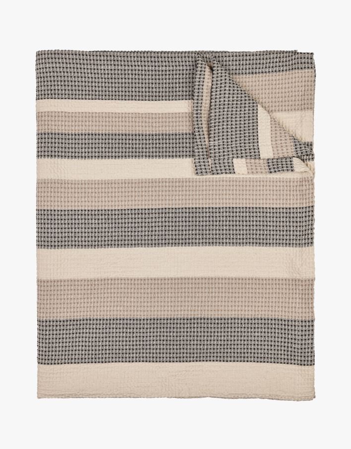 Garnfarget og vaffel-vevet sengeteppe med striper i nøytrale farger.